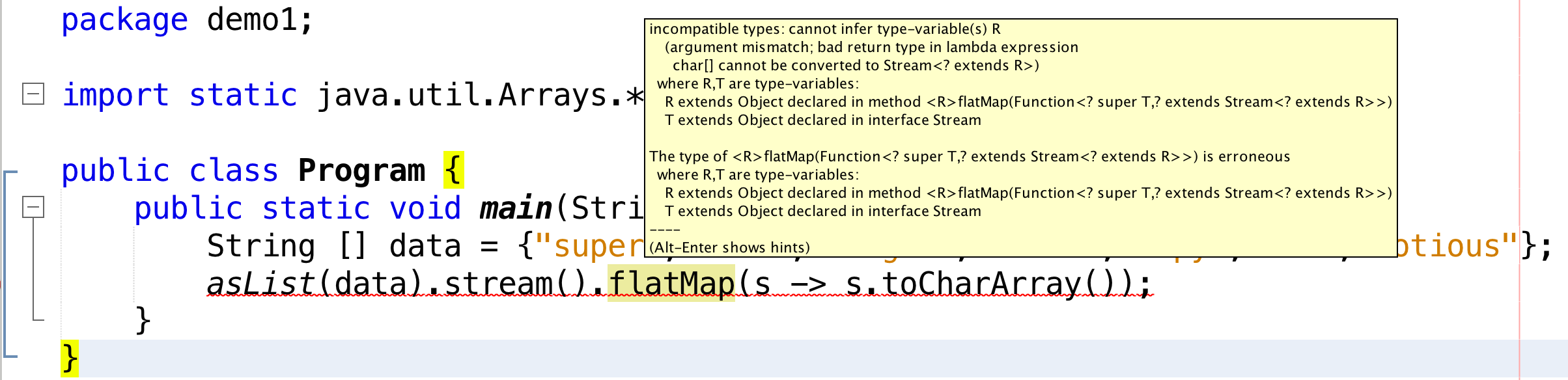 asList(data).stream().flatMap(s -> asList(s.toCharArray()));But this gives us an even more confusing message. In desperation we try returning a stream: