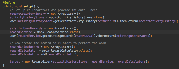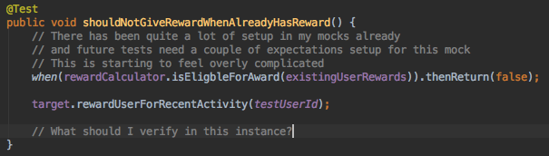 Now to get down to some test writing. I had to think for a minute as the first test doesn’t seem immediately obvious with my nested If condition but I decide to implement shouldNotGiveRewardWhenUserAlreadyHasReward.